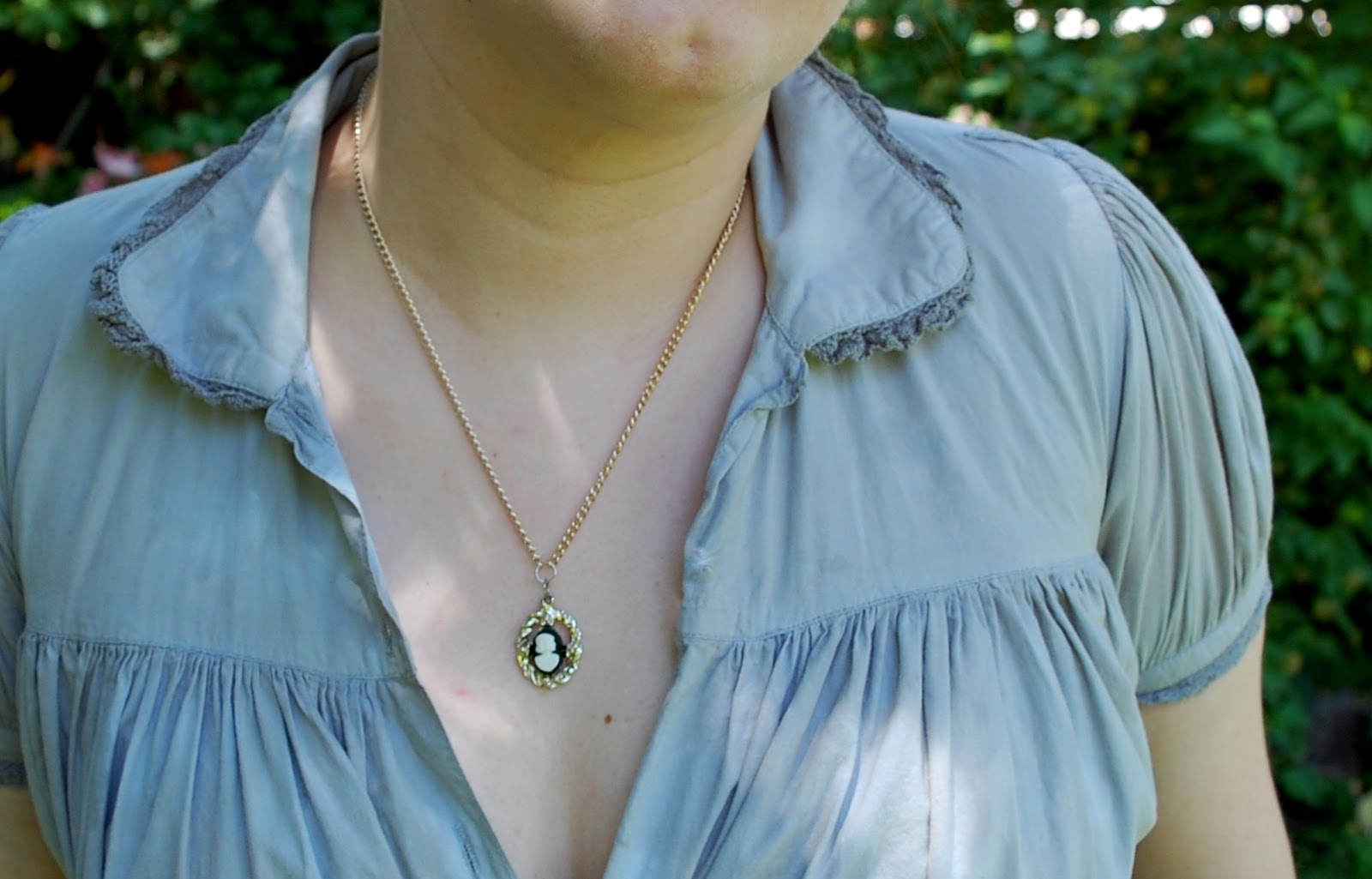 I haven't really gotten dressed up as often as I would like, but I managed this cute Victorian inspired look a couple weeks ago. My original outfit was very different, but the humidex was very high that day and I needed something lighter. I settled on a Victorian underwear look instead of the prim-and-proper look I had planned. The "dress" is actually a nightgown I've had since I was a child, which I tried to dye black a few years ago. That obviously didn't work, but instead turned the material a soft, mottled blue-grey. I paired it with my What Katie Did corset, a cameo necklace I made from a broken earring, and a pair of Victorian inspired boots.